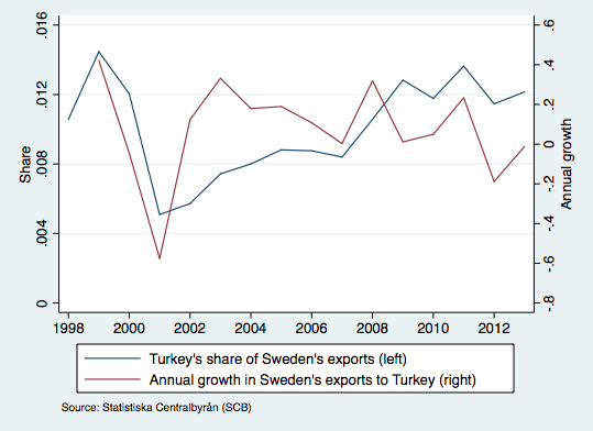 Turkey’s flawed institutions hampers its capacity to become the economic powerhouse that the government claims it has become, which it hasn’t yet, but nonetheless still could. This also limits gains of trade between Swedish and Turkish firms. The Swedish government can be a better friend to Turkey and its people by putting an end to repeating the Turkish governments talking points and shifting to an institutional focus on Turkey and its need for democratic reform. A Turkey with more open and democratic institutions will benefit firms and people alike, and not just those with the good connections to the government.