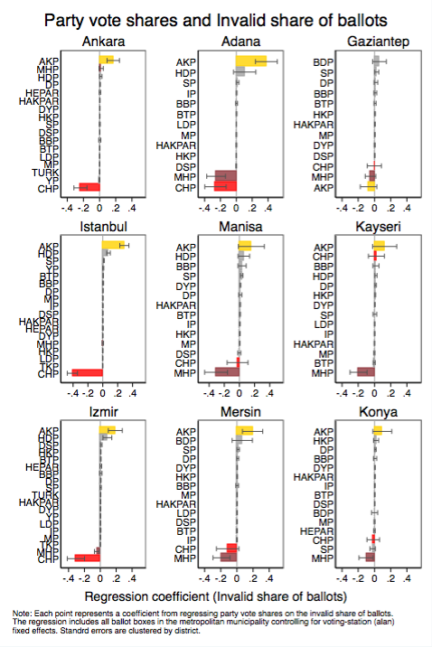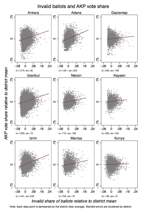 “The explanation for why invalid ballots appear to bias votes towards the AKP could be due to voting irregularities. Without knowing exactly how this would occur, one very simple way would be if there was a system to more intensively declare invalid opposition ballots than AKP ballots.”