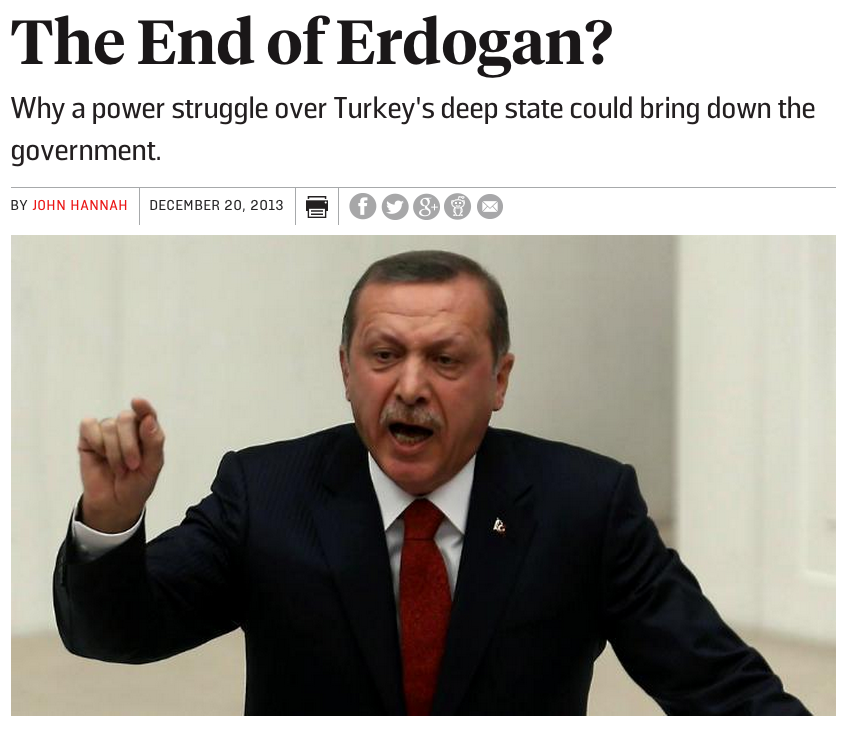 NYT isn’t alone in its very recent perception pirouette – most mainstream outlets today tend to stumble over each other noting Turkey’s authoritarian turn, crackdown on media freedoms, and it’s leader’s taste for being on the front page of every single newspaper (ever). In some cases the changes – not just in text but also in everything else – have been less than subtle. See below comparing one article published in Foreign Policy Magazine in mid-2011 with another published end of 2013: