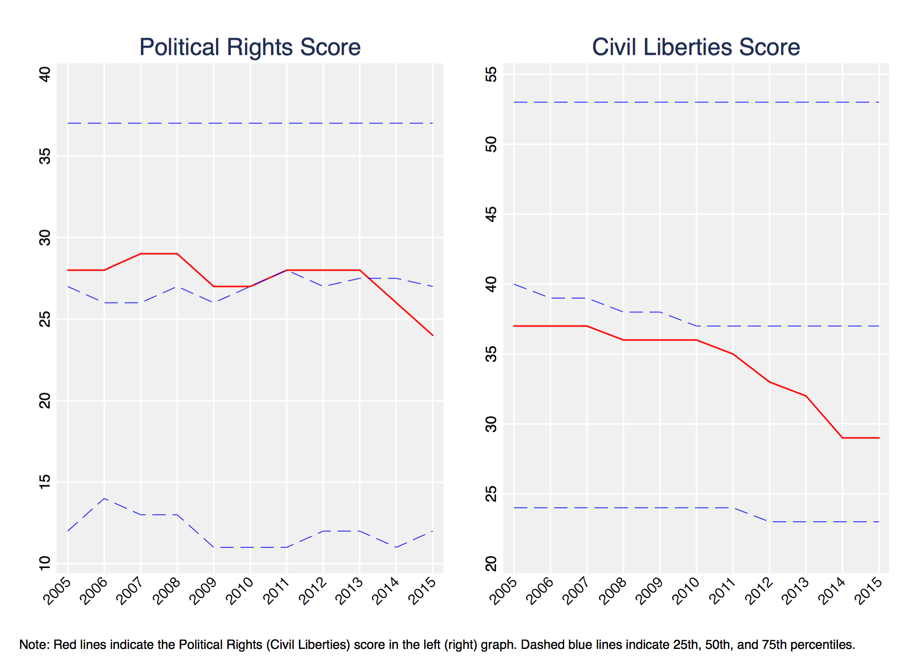 As a start, I’ve downloaded the aggregate and subcategory scores available on the website. Using these, the below graphs plot the evolution of the PR and CL scores for Turkey between 2005-2015 (i.e. the period for which FH provides this data). I’ve also plotted the 25th, 50th, and 75th percentile in the respective scores to allow comparison of Turkey’s fared relative to the distribution of freedoms over time.