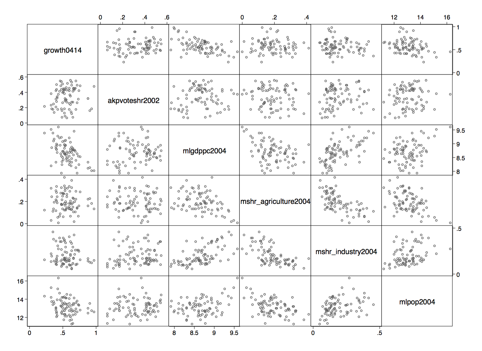 As for the set of controls I use the variables already included in Turkstat’s province-level GDP data, namely the level of GDP per capita, population, the GDP shares of the agriculture and industry sectors respectively, and geographic fixed effects for whether the province is in the west, east, south, or north of the country. The below matrix graph shows a number of bivariate relationships being non-linear (in particular that between the AKP vote share in 2002 and both log GDP per capita in 2004 and industry share of output in 2004 respectively). For this reason I include quartile dummy variables for each of the plotted variables, allowing their correlations between the outcome and other explanatory variables to be non-linear.