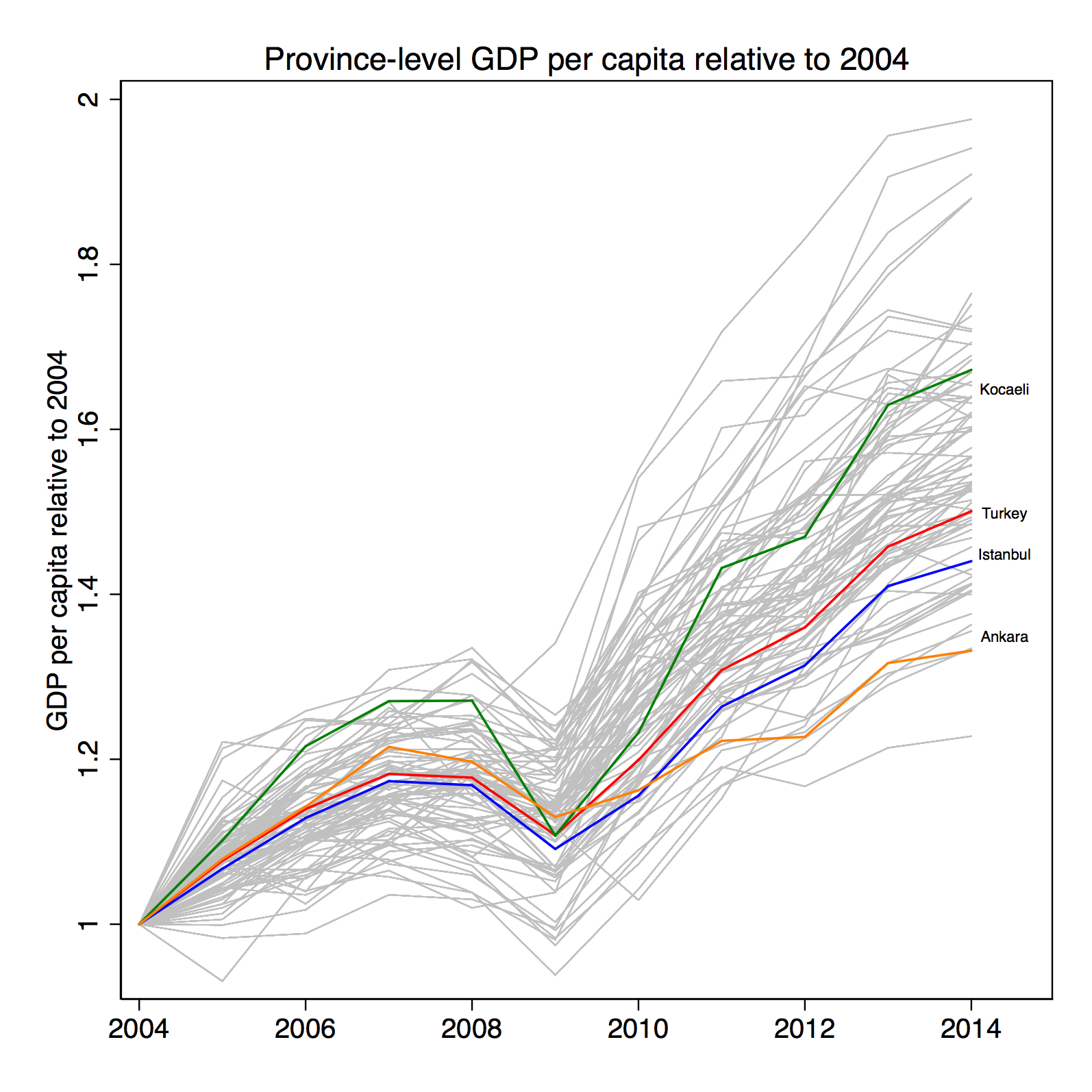 As for the evolution of GDP per capita over time, the below graph plots the province-level values (deflated by the World Bank’s GDP deflator) indexed to their corresponding 2004 values. Interestingly, Kocaeli, has preformed rather well, whereas Ankara has growth the second-slowest of all provinces.