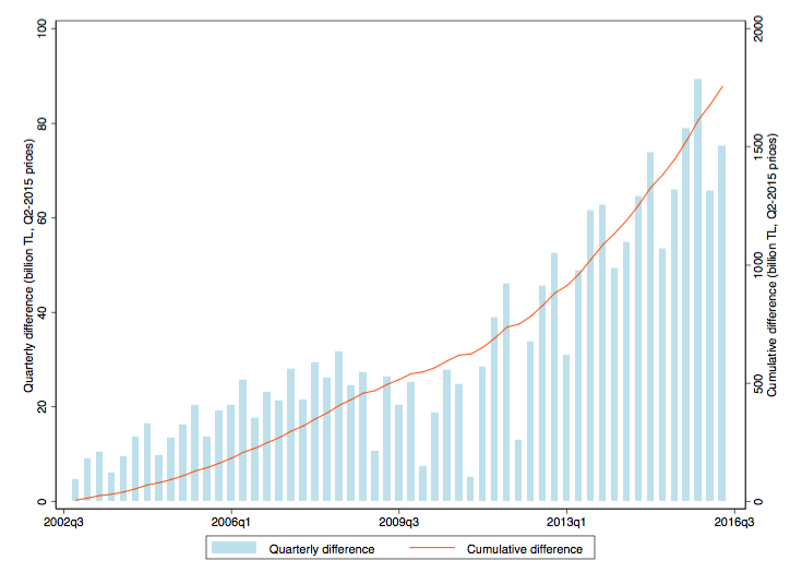The last figure, below, plots the the quarterly differences in new vs old total investments from the last quarter of 2002 and onwards in blue bars, as well as the cumulative amount (red line). (These figures have been converted into constant Q2 2015 prices.) In the final period the cumulative amount of added investments was TL 1.76 trillion. With the current exchange rate of 3.54 TL/USD, this corresponds to roughly $496 billion. In 2015, the World Bank recorded Sweden has having roughly this amount as GDP.