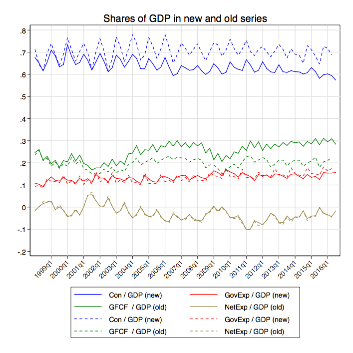 The changes expressed in shares of GDP can be seen below. The new series implies much higher investment shares of GDP, mostly at the expense of consumption.