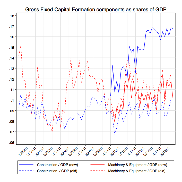 In the old series, machinery & equipment carried a higher share of GDP than construction. In the new series, which only includes subcomponent data from the first quarter of 2009, this is reversed. Moreover, from this quarter onwards, the construction investment share of GDP increases rapidly from around 11.5 % in the beginning of the subsample to 16.5% at the end of it. The gap between new and old investments is therefore almost driven by the gap in construction investments.
