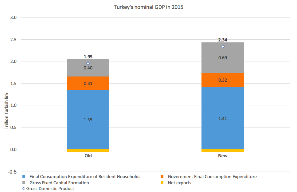 GDP in the new series (TL 1.95 trillion) is almost exactly 20 percent higher than it is in the old series (TL 2.34 trillion). With the exception of a 4 % increase in household consumption expenditure, this change is entirely due to an increase in gross fixed capital formation of roughly three-quarters (from TL 400 billion to TL 690 billion).
