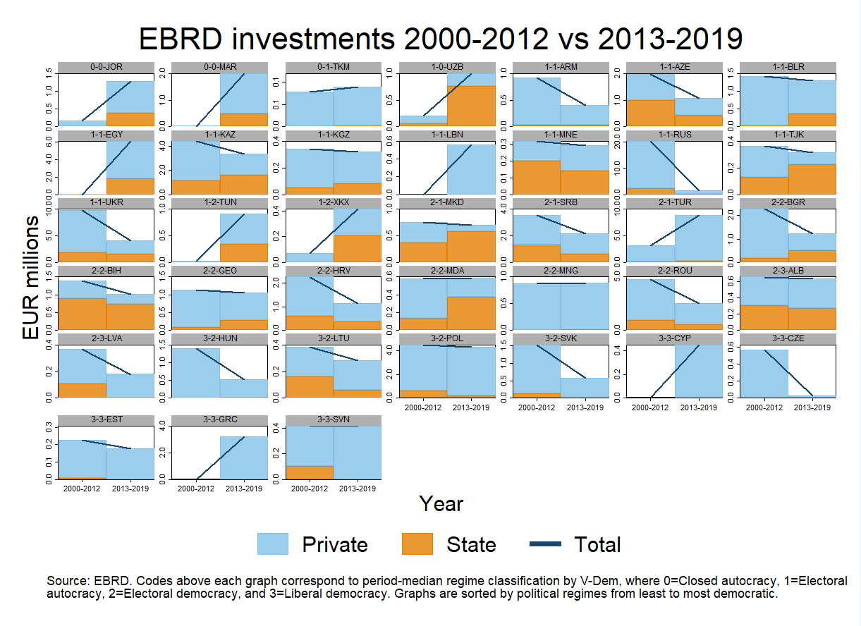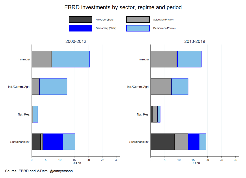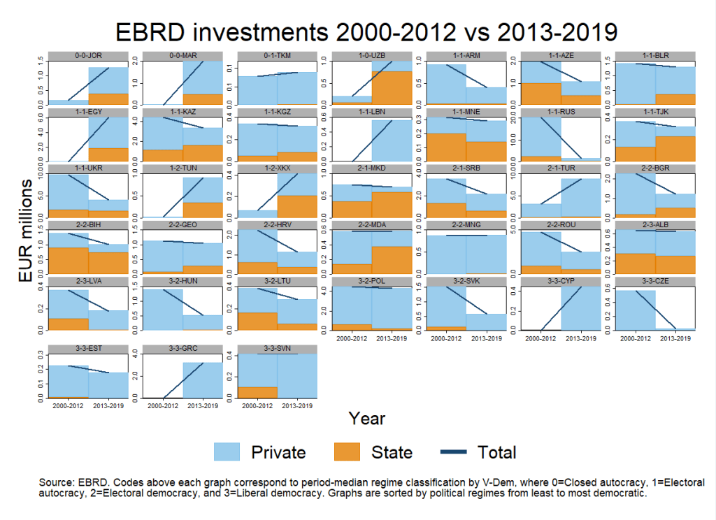 Especially since 2013, the euro value of EBRD investments in autocratic countries have risen much faster than those in democratic countries, as shown below using the regime classification of Varieties of Democracy. This is despite investments in Russia declining rapidly since 2009 to the point where they cease after 2014 and sanctions make the country largely impossible to invest in. Among the democratic sample is also Czech Republic where the EBRD ceased activities in 2008 (and remains the only country to have “graduated” from the EBRD).