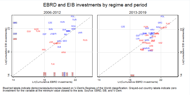 In both time periods, the EIB tends to invest larger sums in democracies than the EBRD. As for investments in autocracies in the earlier period, the EIB is more invested in the Middle East than the EBRD, whereas the latter has more activity in Russia and some Central Asian countries (where EIB investments were zero, as indicated by the gray labels on one side of the axis in the graphs). In the latter period, the EBRD has increased its investments in several democracies yet, and as shown before, even more so in autocracies where the EBRD branched out into especially the Middle East while also expanding operations in Kazakhstan and Uzbekistan. In the latter period EIB and EBRD have also become more co-invested, and are especially correlated in countries like Egypt, Turkey, etc. Nonetheless, even within the sample of countries that the EBRD has ever invested in, the EIB tends to be more active in democracies.