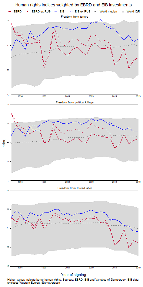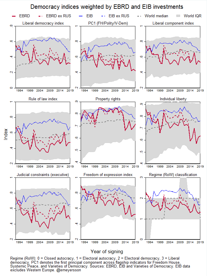 Another way to visualize the data is to weight democracy indices by EBRD investments and comparing this “EBRD universe” to the world median and interquartile range (the 25th and 75th percentiles of the distribution). I continue to focus on data from V-Dem, but for the sake of inclusion, I also construct the first principal component of indices from three common sources: V-Dem’s Liberal Democracy Index, the average of Freedom House’s Civil and Political Liberties indices, and the Polity IV index (upper middle panel). Since Russia disappears from the sample in 2014, I also plot one line with and without the country in the EBRD sample. And finally, I’ve also added the corresponding EIB-weighted index for the subsample of EIB destinations outside of Western Europe (effectively limited these countries to developing and emerging countries). The comparison is relevant as they are both Europe-centric institutions, and both considered in competition for a future role as the EU’s development bank.