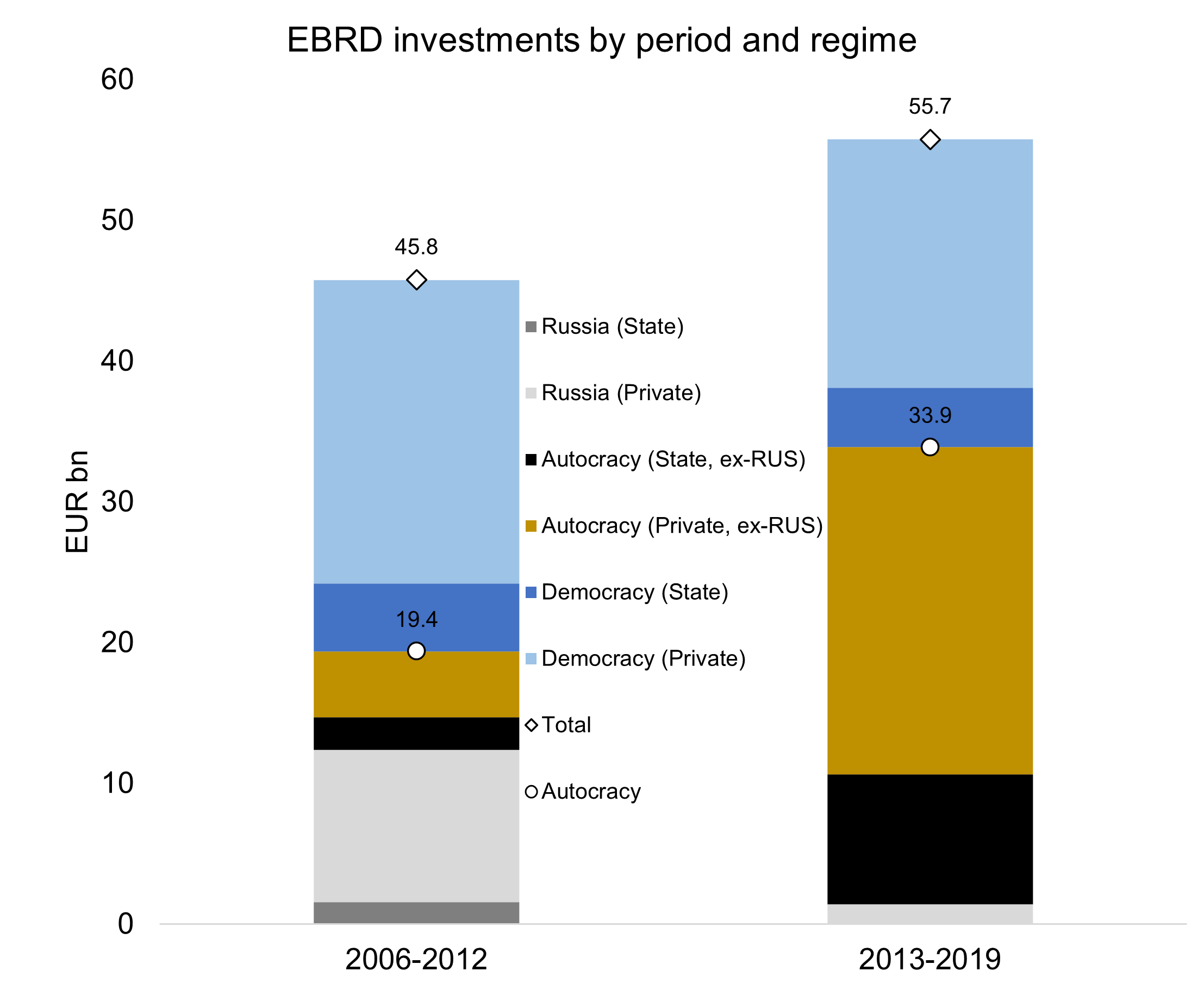 Two thirds of all investments went to autocratic countries in 2019, and a fifth went to autocratic governments. If we instead group the data by two equally large time periods, 2006-2012 and 2013-2019, we see further the degree to which the EBRD is financing autocratic countries: