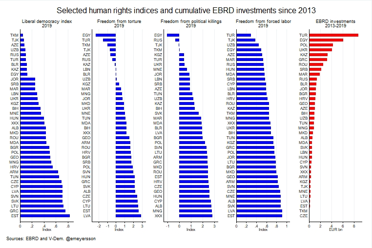 The main destination of this post, however, isn’t the research section of the EBRD. Despite some of my comments about the official reports, the EBRD has throughout the years consistently produced excellent research output in academic publications and its working papers. Instead, this is an issue for management and the bank’s shareholders. The Bank has clearly moved away from its original statues. Either it changes course or it changes the statues. If the real goal is to go from a regional development bank that invests in democracies to a development bank that invests with geopolitical interests in mind, this should become more clearly stated. The EU and the EBRD wouldn’t be the first institutions to realize that interests trump values. We don’t observe the real reasons for the EBRD’s actions because they are poorly, if at all, explained. There is practical debate to be had over the costs and benefits of the EU and its institutions moving to new frontiers in development banking, and the EBRD plays an important role in this.